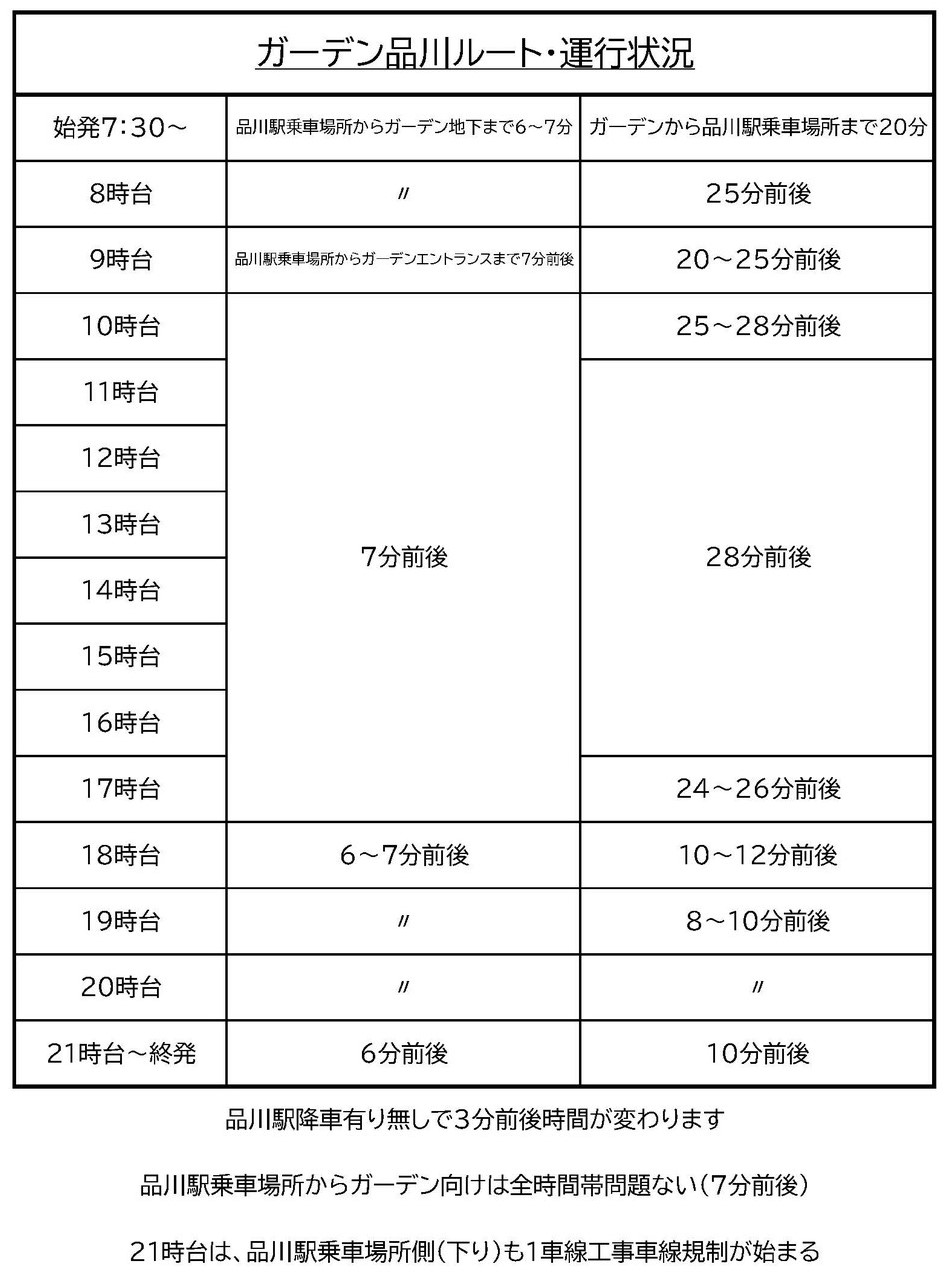 品川駅の乗車場所・ガーデングレイスの乗車場所ともに、時刻表どおりの発着が難しい状況となっております。