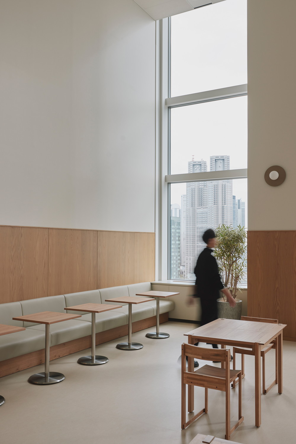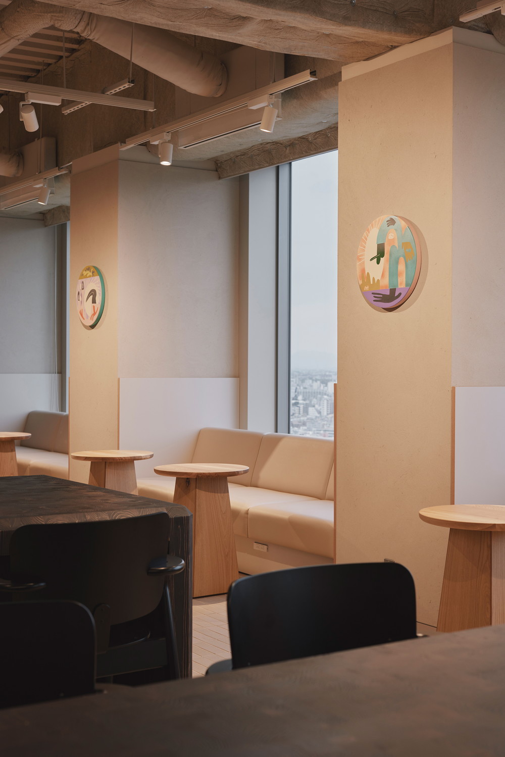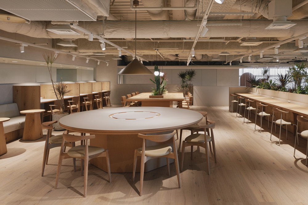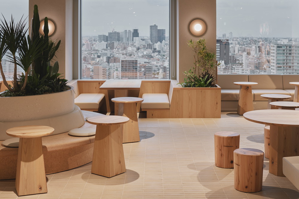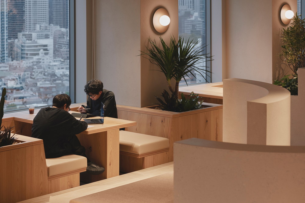 高層階ならではの圧倒的な眺望を最大限に活かし、空を眺めながらゆったりと過ごせるラウンジチェアや、窓台と高さを揃えたテーブルの向こうに景色が広がるボックス席を配置しています。また、既存厨房の床面の高さを活用して一段上がったエリアにワークスペースを設け、複数人でのミーティングから個人の集中作業まで、多様な働き方を実現できる構成としました。