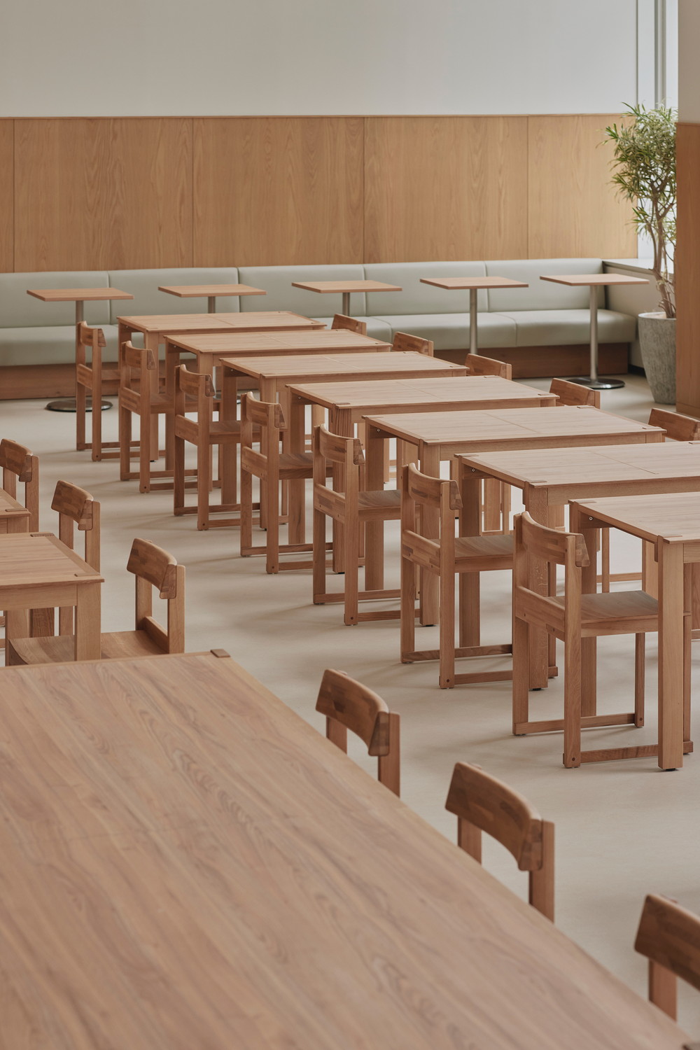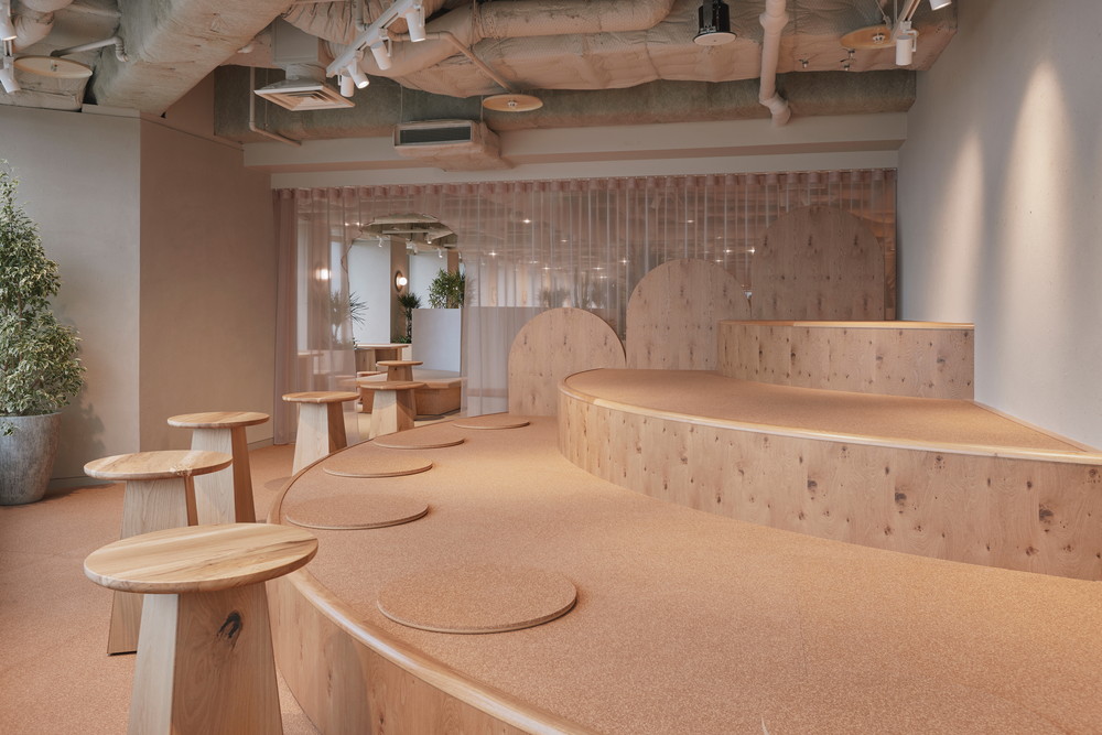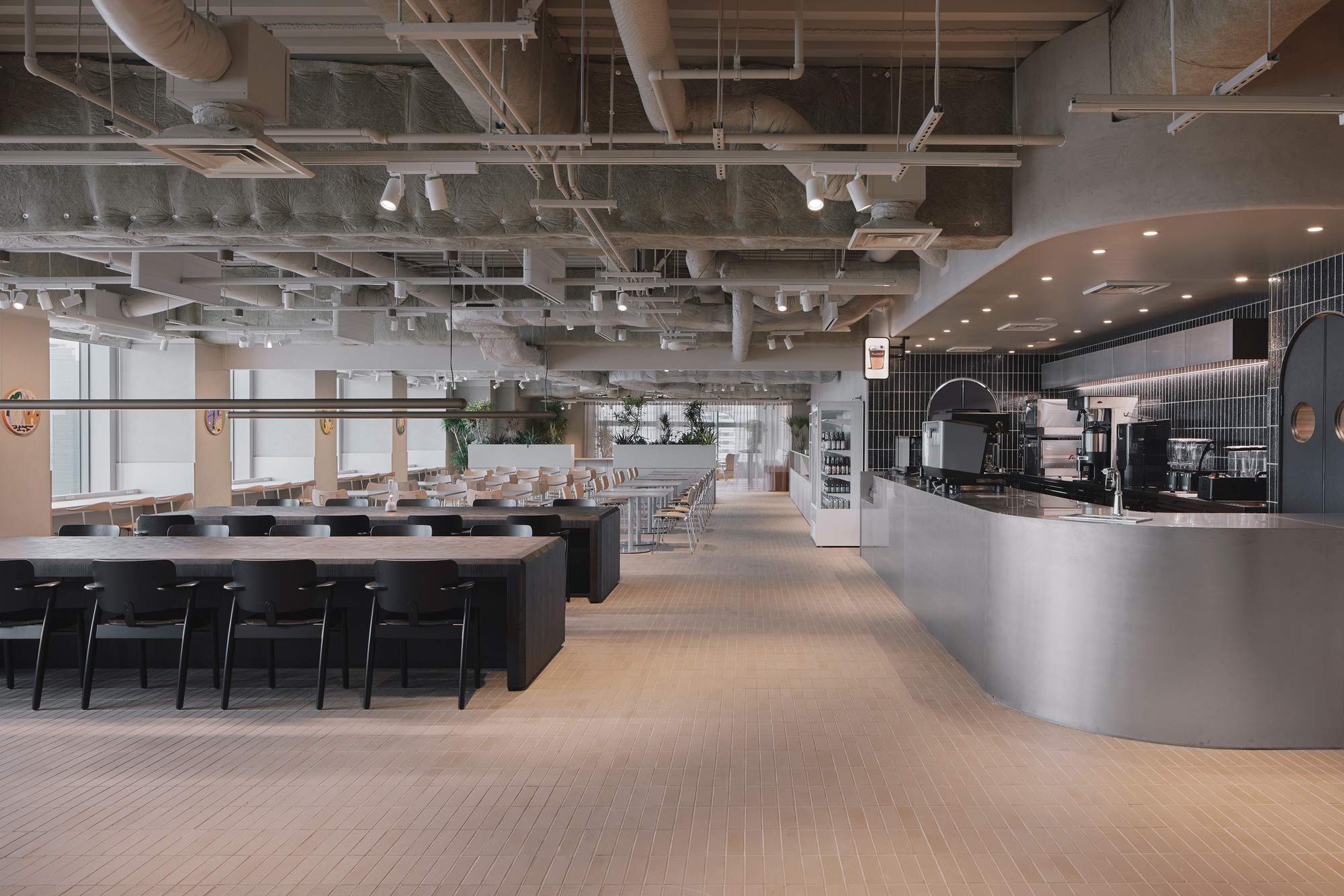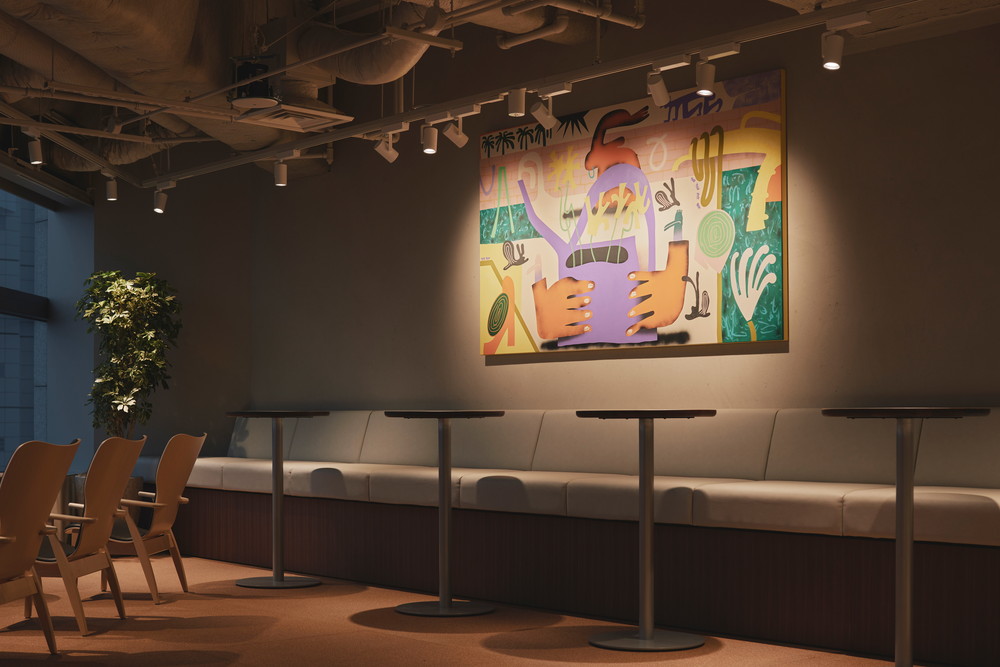 高層階ならではの圧倒的な眺望を最大限に活かし、空を眺めながらゆったりと過ごせるラウンジチェアや、窓台と高さを揃えたテーブルの向こうに景色が広がるボックス席を配置しています。また、既存厨房の床面の高さを活用して一段上がったエリアにワークスペースを設け、複数人でのミーティングから個人の集中作業まで、多様な働き方を実現できる構成としました。